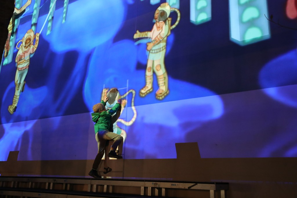 1983 erhielt der Künstler Arno Kauf lin den Auftrag, die Hauswand des neuen Gebäudes an der Buobenmatt zu bemalen. Die grossen Leerräume unddie sich darin befindenden, unbekümmerten Figuren widerspiegeln vor allemeines – die Sehnsucht nach Freiraum. Nach 37 Jahren wollen wir ihnen nun diesen Freiraum geben. Das Mädchen mit dem Drachen, der Junge auf derLeiter und der Mann auf dem Einrad sind nicht mehr länger auf ihrem Platz an der Wand gefangen, sondern erwachen zum Leben. Die Passanten der Theaterpassage sind dazu eingeladen, selber ein Teil des Bildes zu werden und sich mit den Malereien in eine fremde, absurde Welt zu projizieren.